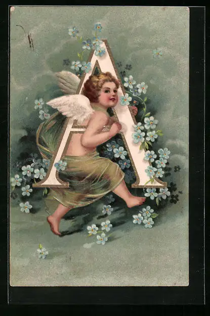 Präge-AK Engel trägt Buchstabe A mit Vergissmeinnicht-Blüten