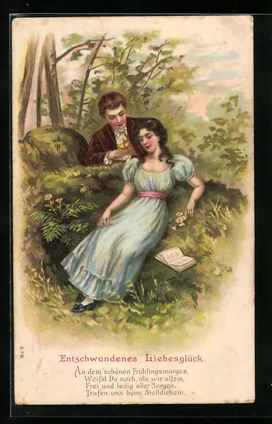 Präge-AK Entschwundenes Liebesglück, Liebespaar am Waldrand