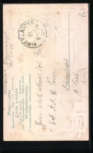 Personenbezogene Daten auf der Rückseite der Karte wurden durch blauen Textmarker unkenntlich gemacht. Die blauen Stellen sind auf die Vorderseite durchgeweicht und wirken sich negativ auf das Postkartenfoto aus