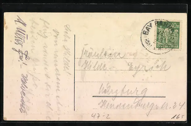Personenbezogene Daten auf der Rückseite der Karte wurden durch blauen Textmarker unkenntlich gemacht. Die blauen Stellen sind auf die Vorderseite durchgeweicht und wirken sich negativ auf das Postkartenfoto aus