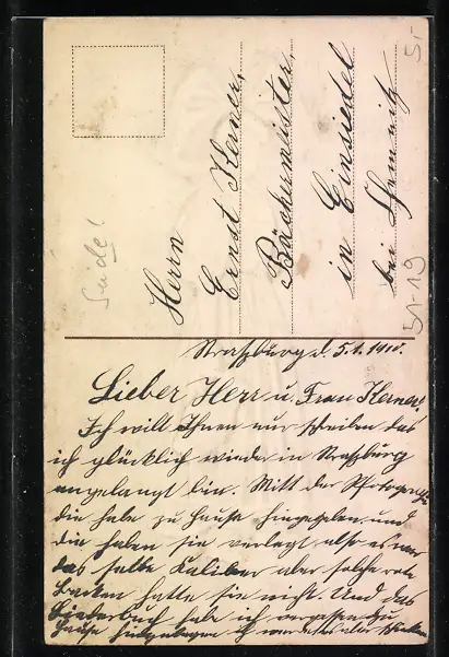 Personenbezogene Daten auf der Rückseite der Karte wurden durch blauen Textmarker unkenntlich gemacht. Die blauen Stellen sind auf die Vorderseite durchgeweicht und wirken sich negativ auf das Postkartenfoto aus