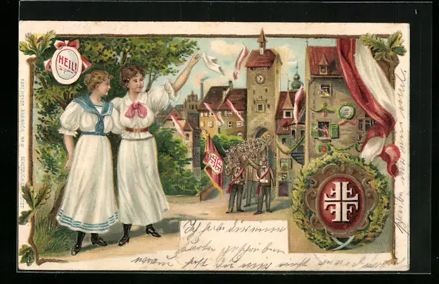 Präge-AK Frauen winken Strassenumzug der Turner, Wappen