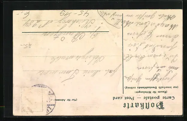 Personenbezogene Daten auf der Rückseite der Karte wurden durch blauen Textmarker unkenntlich gemacht. Die blauen Stellen sind auf die Vorderseite durchgeweicht und wirken sich negativ auf das Postkartenfoto aus