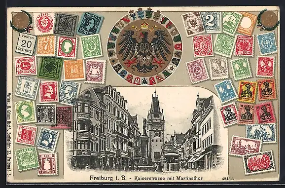 Präge-AK Freiburg i. B., Kaiserstrasse mit Martinsthor, Briefmarken, Wappen