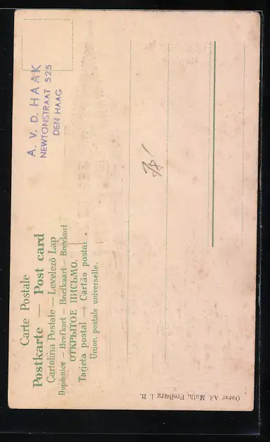 Personenbezogene Daten auf der Rückseite der Karte wurden durch blauen Textmarker unkenntlich gemacht. Die blauen Stellen sind auf die Vorderseite durchgeweicht und wirken sich negativ auf das Postkartenfoto aus