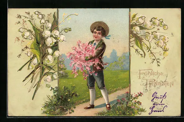 Präge-AK Fröhliche Pfingsten, Junge mit Blumen