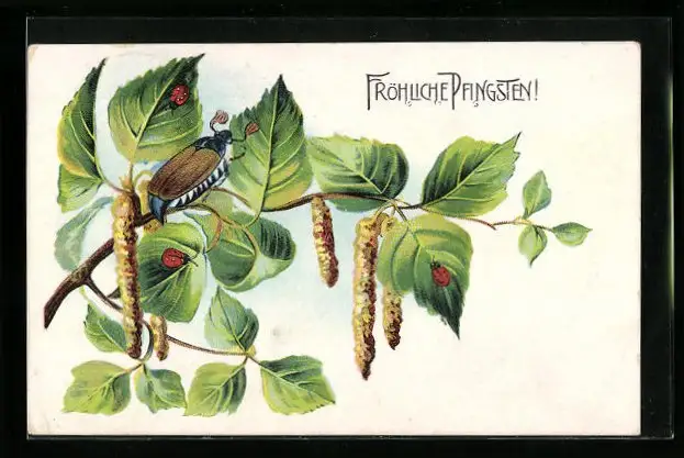 Präge-AK Fröhliche Pfingsten!, Maikäfer auf Birkenzweig