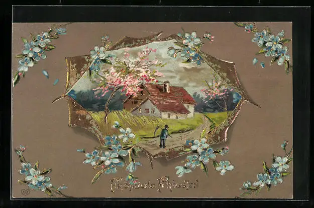Präge-AK Fröhliche Pfingsten, Vergissmeinnicht