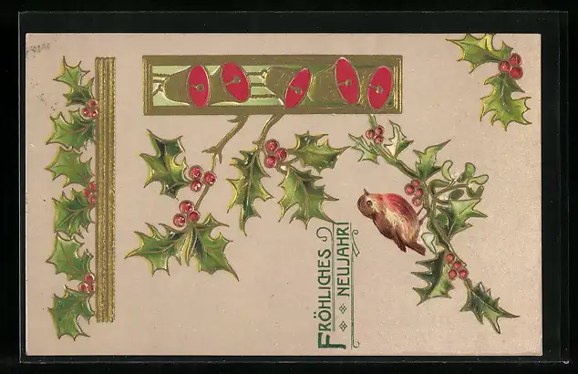 Präge-AK Fröhliches Neujahr, Rotkehlchen sitzt auf einem Stechpalmenzweig