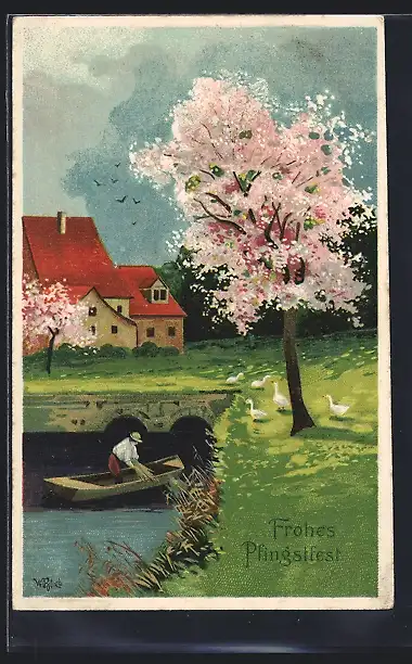 Präge-AK Frohes Pfingstfest, Ruderboot am Ufer