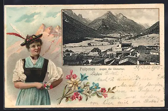 Präge-AK Fulpmes, Ortsansicht gegen die Gletscher, Österreicherin in Tracht im Passepartout