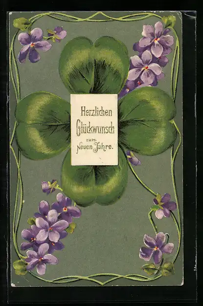 Präge-AK Glückskleeblatt und Veilchen zu Neujahr