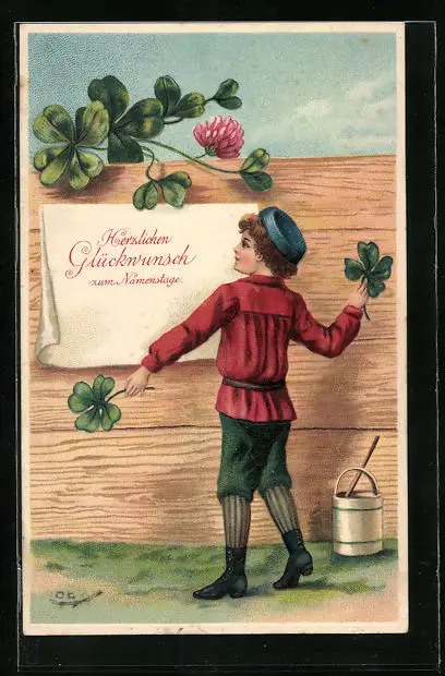 Präge-AK Glückwünsche zum Namenstag, Kleeblatt