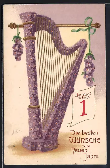 Präge-AK Harfe mit violetten Blumen, Kalenderblatt 1. Januar, Neujahrsgruss