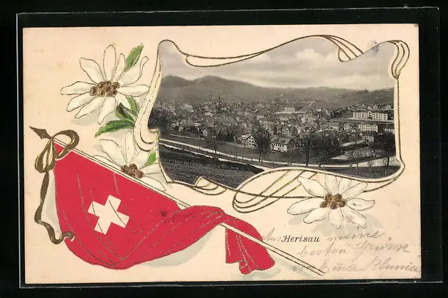 Präge-AK Herisau, Teilansicht, Alpenblumen mit Fahne, Passepartout