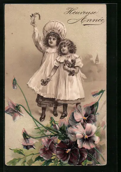 Präge-AK Heureuse Année, Kinder mit Kleeblättern und Hufeisen
