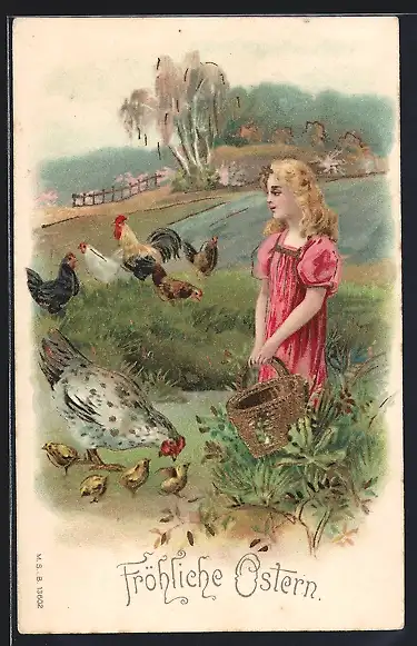 Präge-AK Hühner mit Osterküken, Mädchen mit Korb, Ostergruss