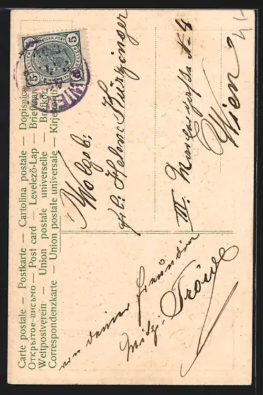 Personenbezogene Daten auf der Rückseite der Karte wurden durch blauen Textmarker unkenntlich gemacht. Die blauen Stellen sind auf die Vorderseite durchgeweicht und wirken sich negativ auf das Postkartenfoto aus