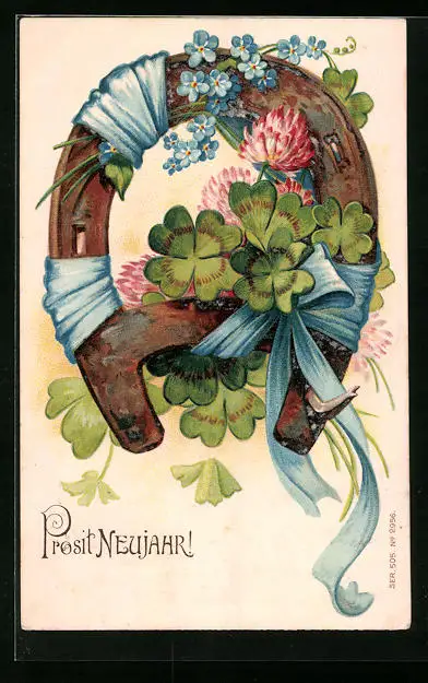 Präge-AK Hufeisen mit Kleeblättern und Schleifen