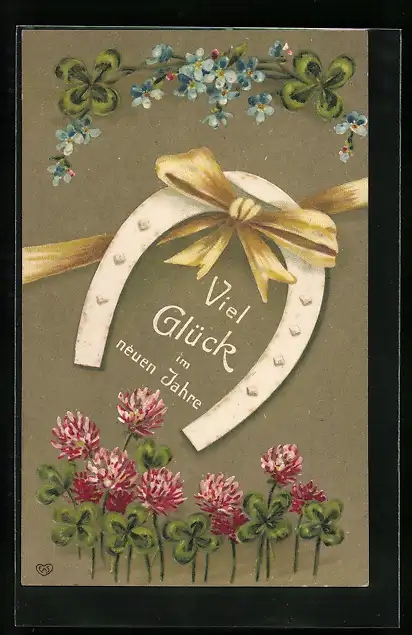 Präge-AK Hufeisen mit Kleeblättern und Vergissmeinnicht, Neujahrsgruss