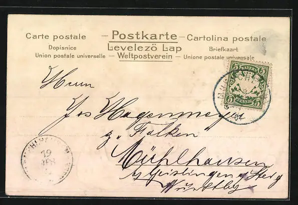 Personenbezogene Daten auf der Rückseite der Karte wurden durch blauen Textmarker unkenntlich gemacht. Die blauen Stellen sind auf die Vorderseite durchgeweicht und wirken sich negativ auf das Postkartenfoto aus