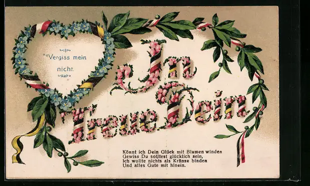 Präge-AK In Treue Dein, Vergissmeinnichtherz mit Zweibundfahnen, Lorbeerzweig
