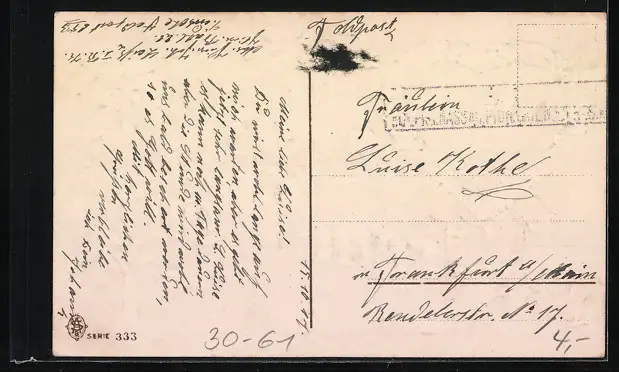 Personenbezogene Daten auf der Rückseite der Karte wurden durch blauen Textmarker unkenntlich gemacht. Die blauen Stellen sind auf die Vorderseite durchgeweicht und wirken sich negativ auf das Postkartenfoto aus