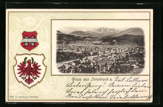 Präge-AK Innsbruck, Blick auf Stadt und Gebirge, Wappen