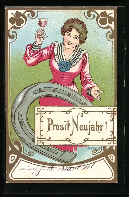 Präge-AK Junge Frau hinter Hufeisen hebt zu Neujahr ihr Glas