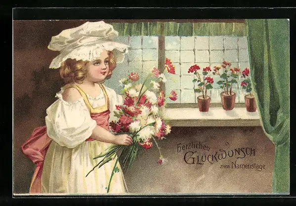Präge-AK Junge Frau mit Blumenstrauss zum Namenstag