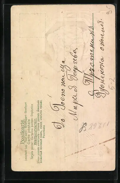 Personenbezogene Daten auf der Rückseite der Karte wurden durch blauen Textmarker unkenntlich gemacht. Die blauen Stellen sind auf die Vorderseite durchgeweicht und wirken sich negativ auf das Postkartenfoto aus