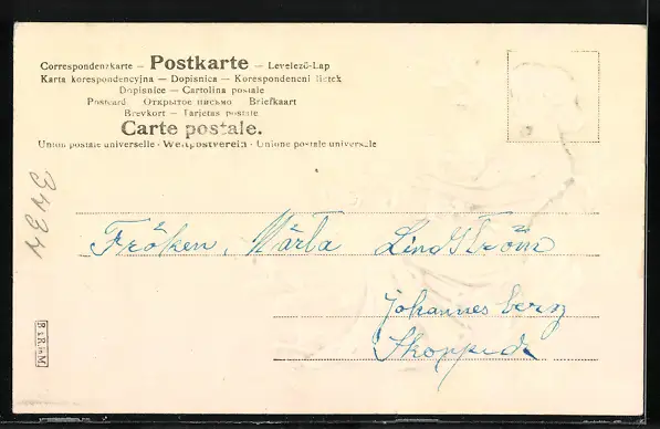 Personenbezogene Daten auf der Rückseite der Karte wurden durch blauen Textmarker unkenntlich gemacht. Die blauen Stellen sind auf die Vorderseite durchgeweicht und wirken sich negativ auf das Postkartenfoto aus