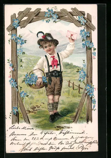 Präge-AK Junge in Tracht überbringt Brief und Blumen