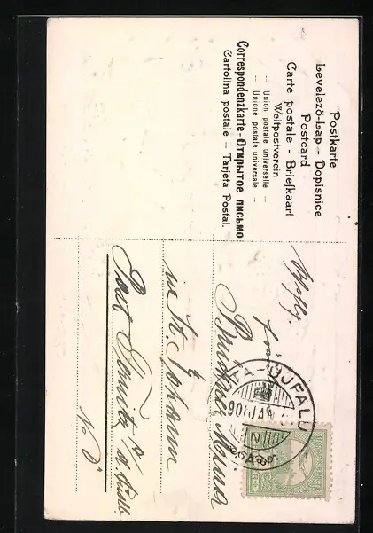 Personenbezogene Daten auf der Rückseite der Karte wurden durch blauen Textmarker unkenntlich gemacht. Die blauen Stellen sind auf die Vorderseite durchgeweicht und wirken sich negativ auf das Postkartenfoto aus