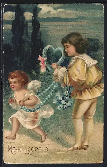 Präge-AK Junge spielt mit Engel und einer Blumenkette, Namenstag Leopold