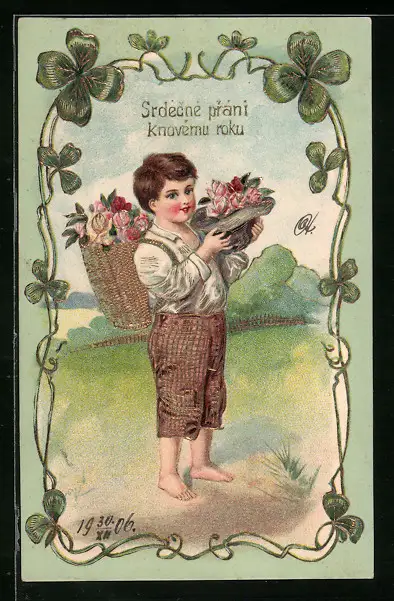 Präge-AK Junger Knirps beim Sammeln von Rosenblüten