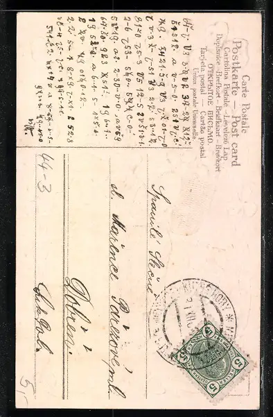 Personenbezogene Daten auf der Rückseite der Karte wurden durch blauen Textmarker unkenntlich gemacht. Die blauen Stellen sind auf die Vorderseite durchgeweicht und wirken sich negativ auf das Postkartenfoto aus