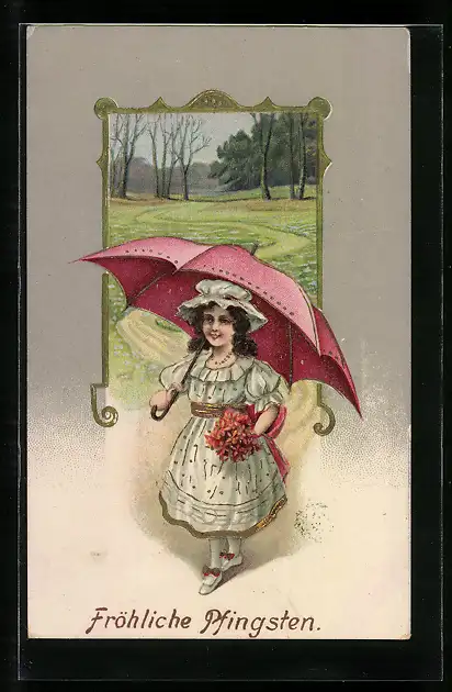 Präge-AK Junges Mädchen zu Pfingsten mit Schirm und Blumenstrauss