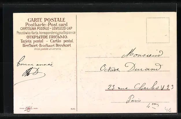 Personenbezogene Daten auf der Rückseite der Karte wurden durch blauen Textmarker unkenntlich gemacht. Die blauen Stellen sind auf die Vorderseite durchgeweicht und wirken sich negativ auf das Postkartenfoto aus