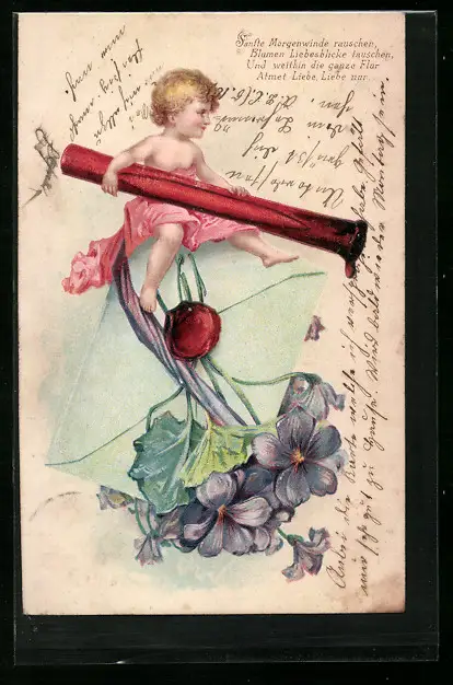 Präge-AK Kind mit Siegel auf einem Kuvert, Veilchen