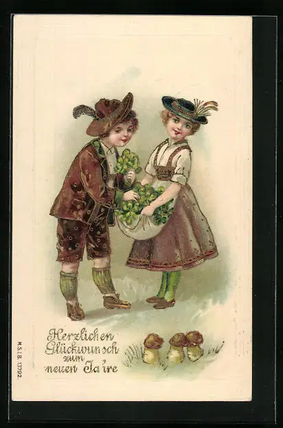 Präge-AK Kinder in Tracht mit Kleeblättern