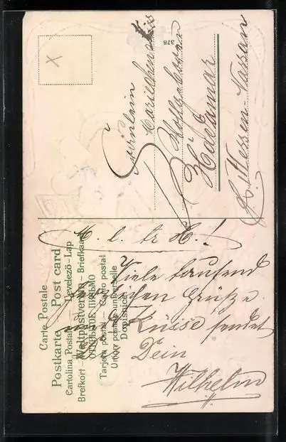 Personenbezogene Daten auf der Rückseite der Karte wurden durch blauen Textmarker unkenntlich gemacht. Die blauen Stellen sind auf die Vorderseite durchgeweicht und wirken sich negativ auf das Postkartenfoto aus