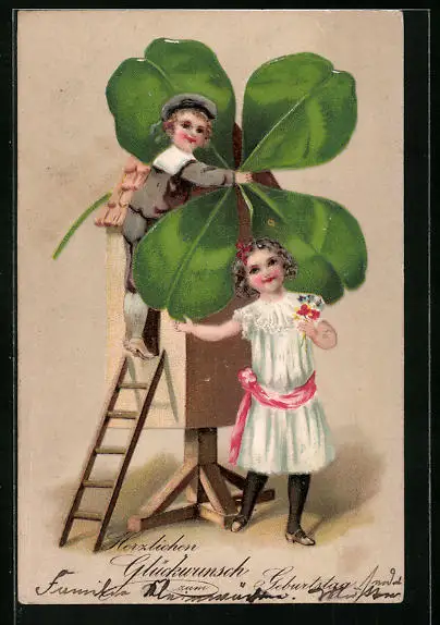 Präge-AK Kinder mit Windmühle aus Kleeblatt