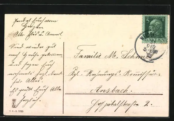 Personenbezogene Daten auf der Rückseite der Karte wurden durch blauen Textmarker unkenntlich gemacht. Die blauen Stellen sind auf die Vorderseite durchgeweicht und wirken sich negativ auf das Postkartenfoto aus