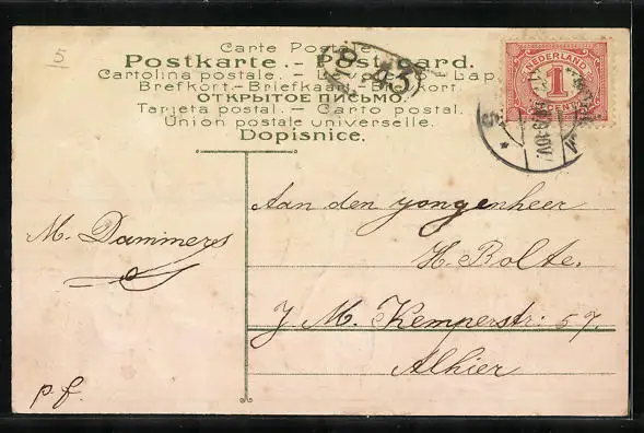 Personenbezogene Daten auf der Rückseite der Karte wurden durch blauen Textmarker unkenntlich gemacht. Die blauen Stellen sind auf die Vorderseite durchgeweicht und wirken sich negativ auf das Postkartenfoto aus