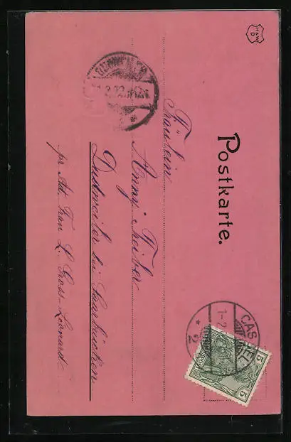Personenbezogene Daten auf der Rückseite der Karte wurden durch blauen Textmarker unkenntlich gemacht. Die blauen Stellen sind auf die Vorderseite durchgeweicht und wirken sich negativ auf das Postkartenfoto aus