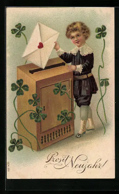 Präge-AK Kleiner Junge mit Brief am Postkasten, Neujahrsgruss
