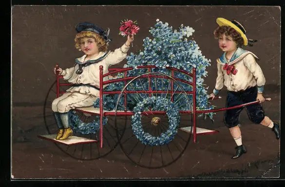 Präge-AK Kleiner Matrose in blumengeschmücktem Wagen