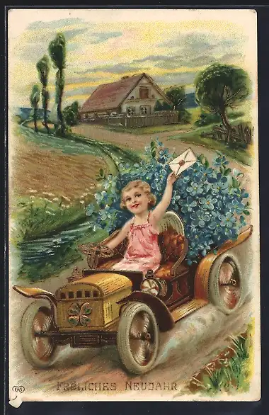 Präge-AK Kleiner Neujahrsengel in Auto voller Vergissmeinnicht