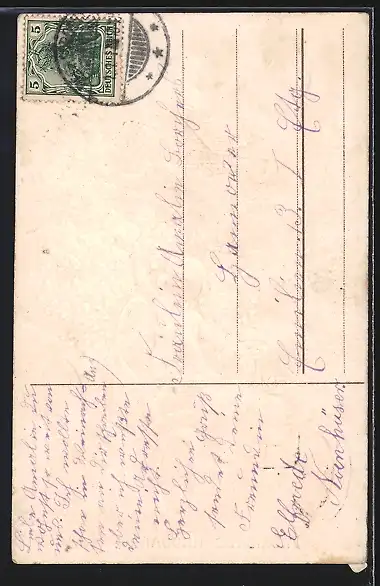 Personenbezogene Daten auf der Rückseite der Karte wurden durch blauen Textmarker unkenntlich gemacht. Die blauen Stellen sind auf die Vorderseite durchgeweicht und wirken sich negativ auf das Postkartenfoto aus